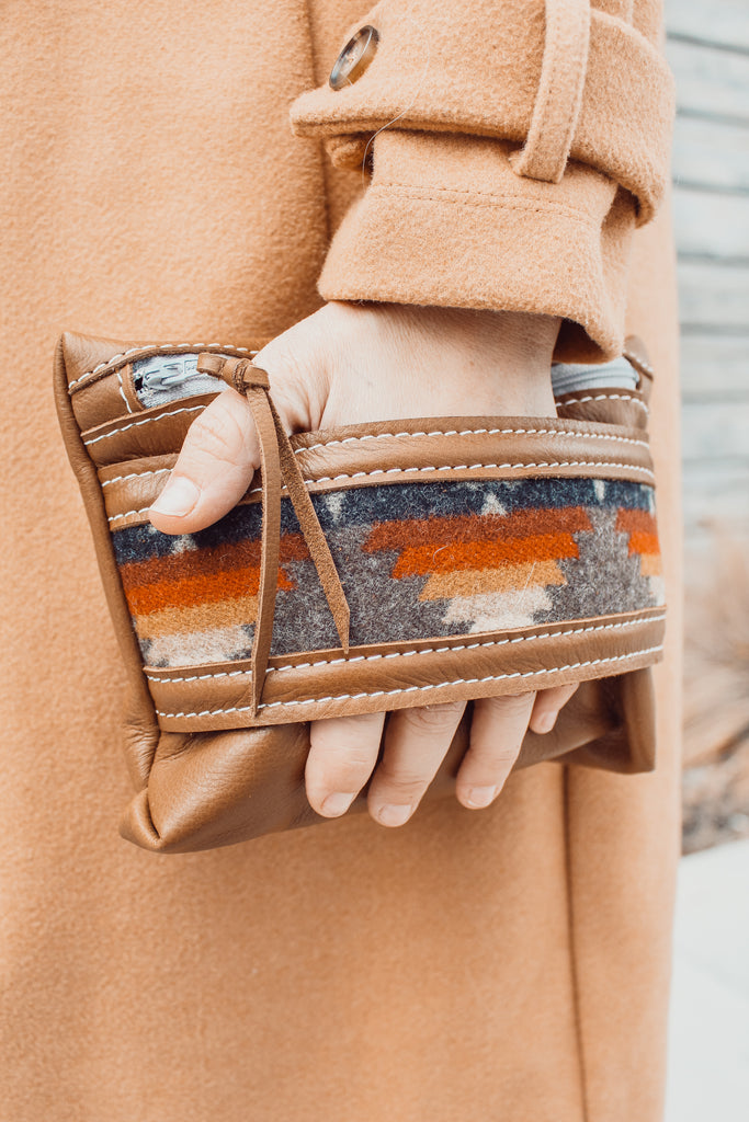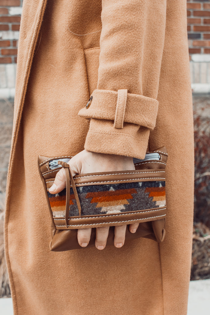 This clutch is designed to fit easily into larger bags, pulled out when you only need to take a couple things with you. Small but striking, with elegant details like cat nose corners and the Pendleton Wool inlay.