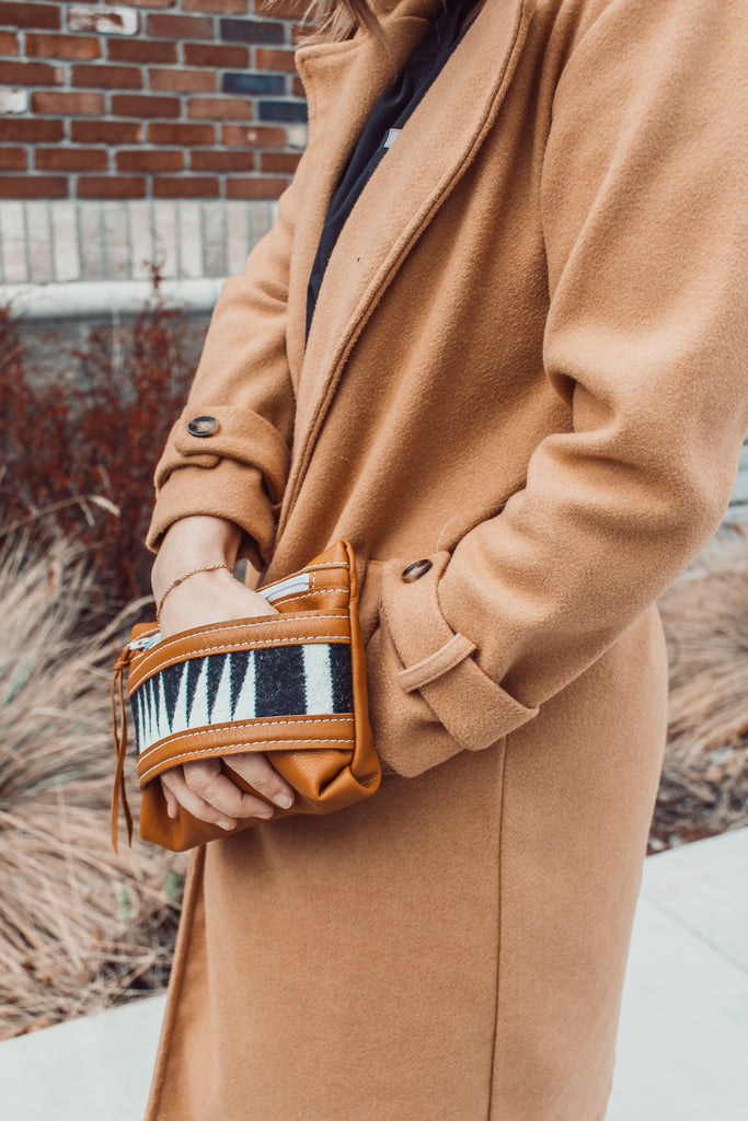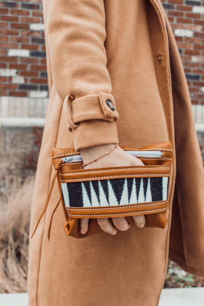 This clutch is designed to fit easily into larger bags, pulled out when you only need to take a couple things with you. Small but striking, with elegant details like cat nose corners and the Pendleton Wool inlay.