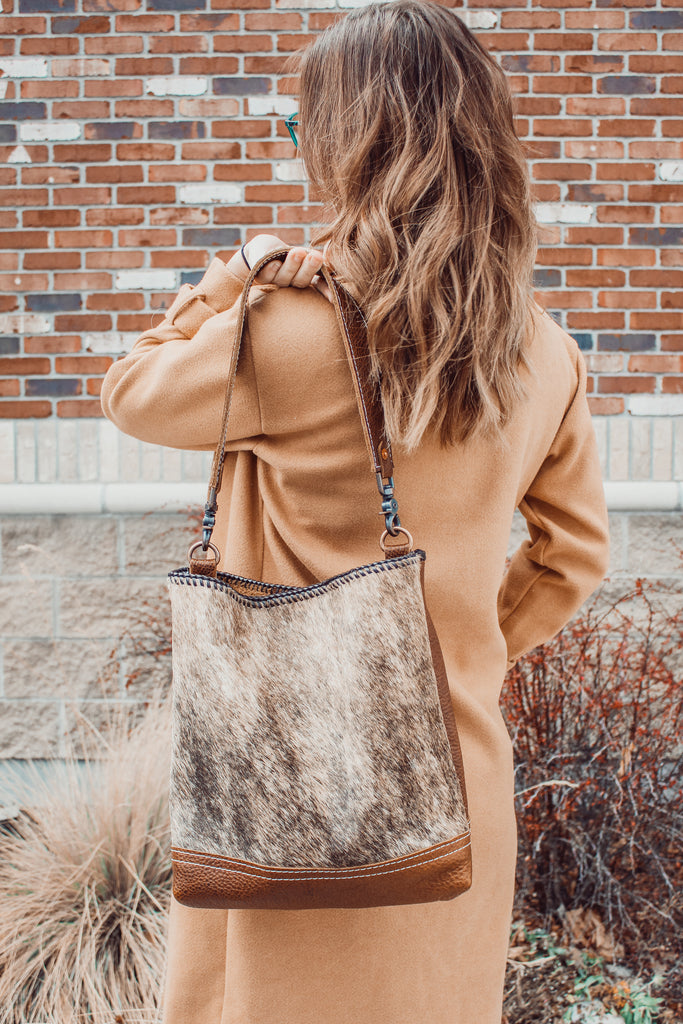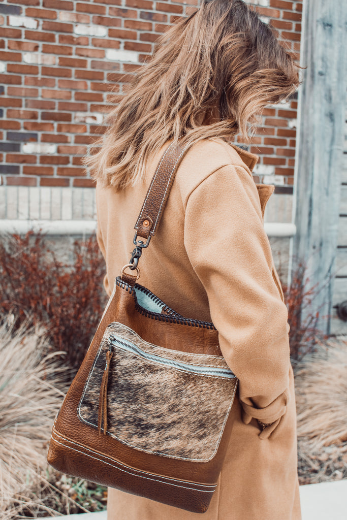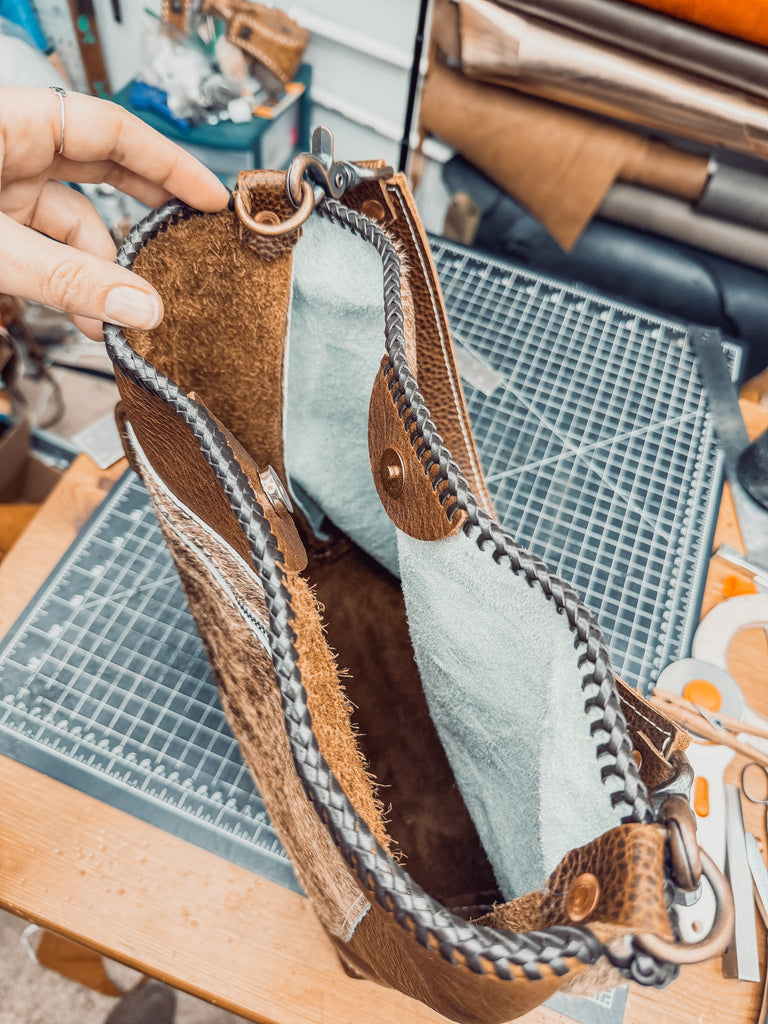 This reversible shoulder bag is the only of its kind. Built with a beautiful peppered cream hair-on cowhide, and a pebbly cognac bison hide. The black double loop laced mouth gives it extra flare, while the wider shoulder strap and internal magnetic closure add to its practicality.